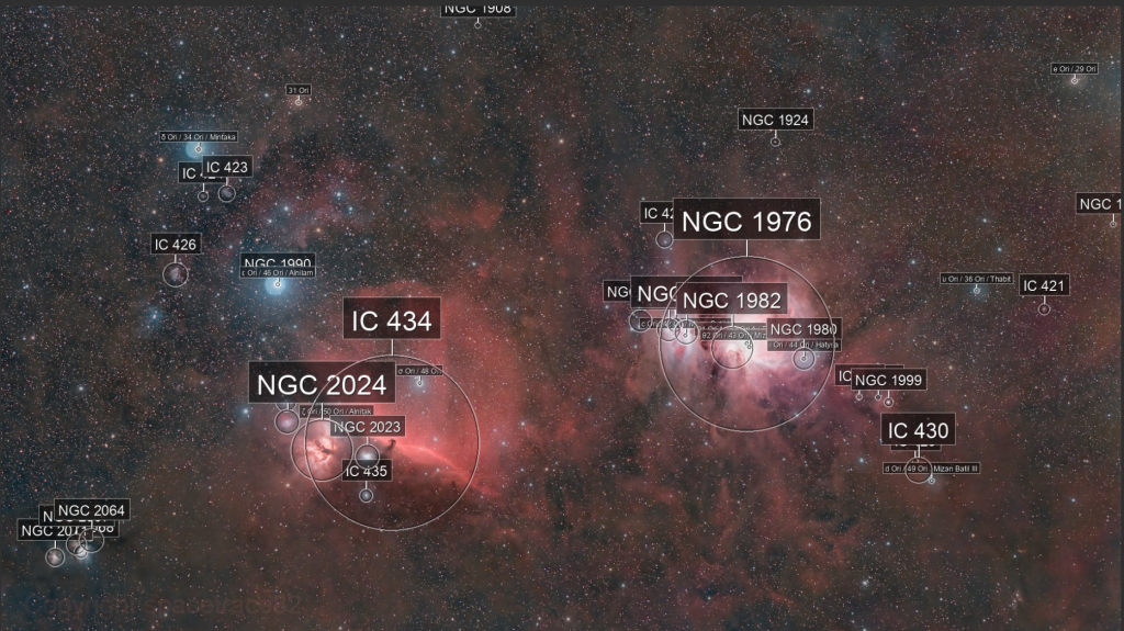 My latest image captures the breathtaking beauty of Orion’s Belt and Sword, and the expansive dust clouds that shroud the region. The Image below includes the annotations of the objects to be found.