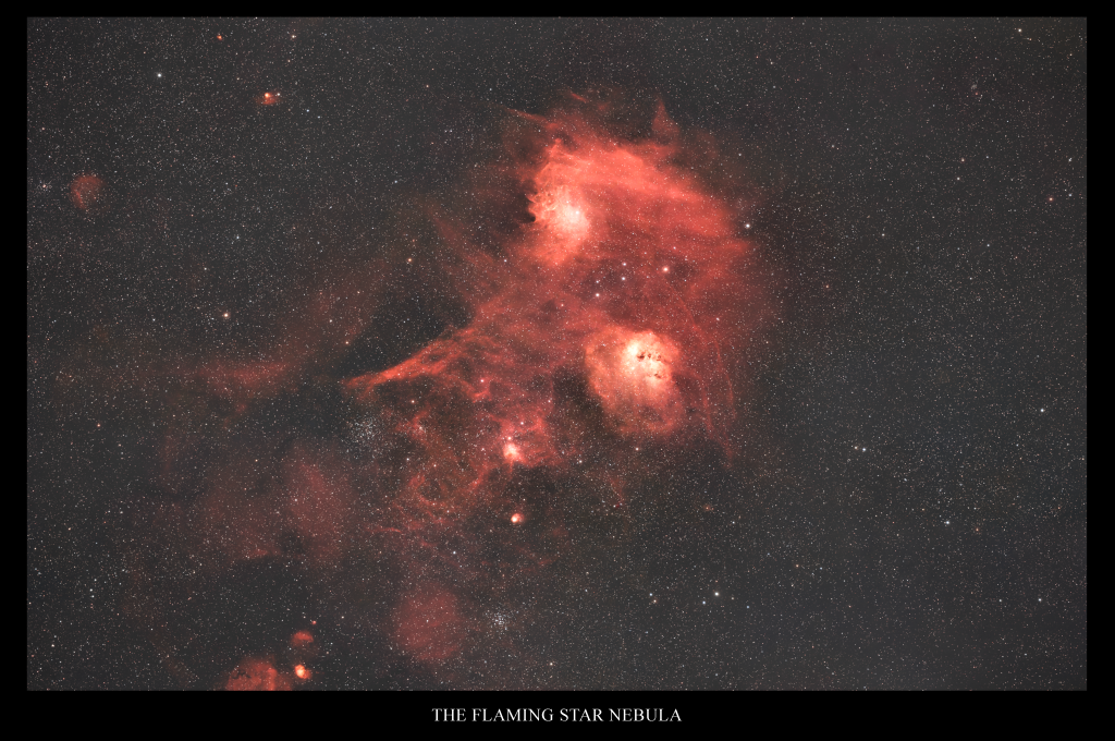 The Flaming Star Nebula (IC 405) is a stunning emission and reflection nebula in the constellation Auriga, about 1,500 light-years from Earth. It is a mix of glowing hydrogen gas (emission) and dust that reflects the light of nearby stars (reflection), creating a beautiful, fiery appearance. What I find suprising is the nebulosity which appears to connect the Flame nebula with the Tadpole Nebula (IC 410) which is an H II region, however this is infact located 12,400 light-years away.